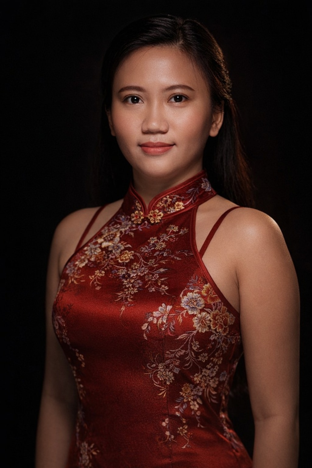 Create a photorealistic, cinematic vertical portrait of a young East Asian woman celebrating Lunar New Year in a festive home setting. Emphasize cultural elements and a joyful, respectful atmosphere.