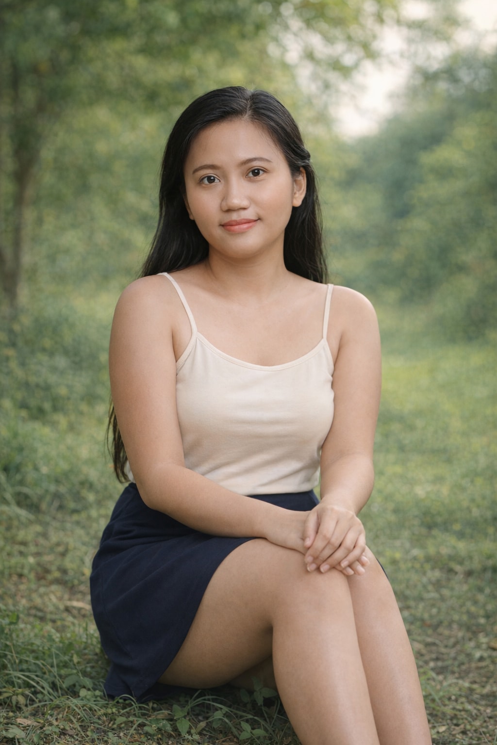 Create a tasteful and stylish portrait of a young Indonesian woman, highlighting modern fashion and elegance in a casual setting.