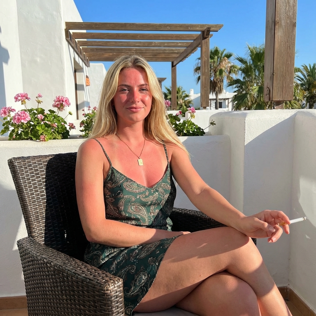 Wearing a dark green patterned slip dress, she sits with crossed legs and holds a cigarette, framed by white stucco architecture and palm trees. The bright daylight creates a high-contrast summer atmosphere, highlighting her relaxed posture and the vibrant pink flowers in the background.
