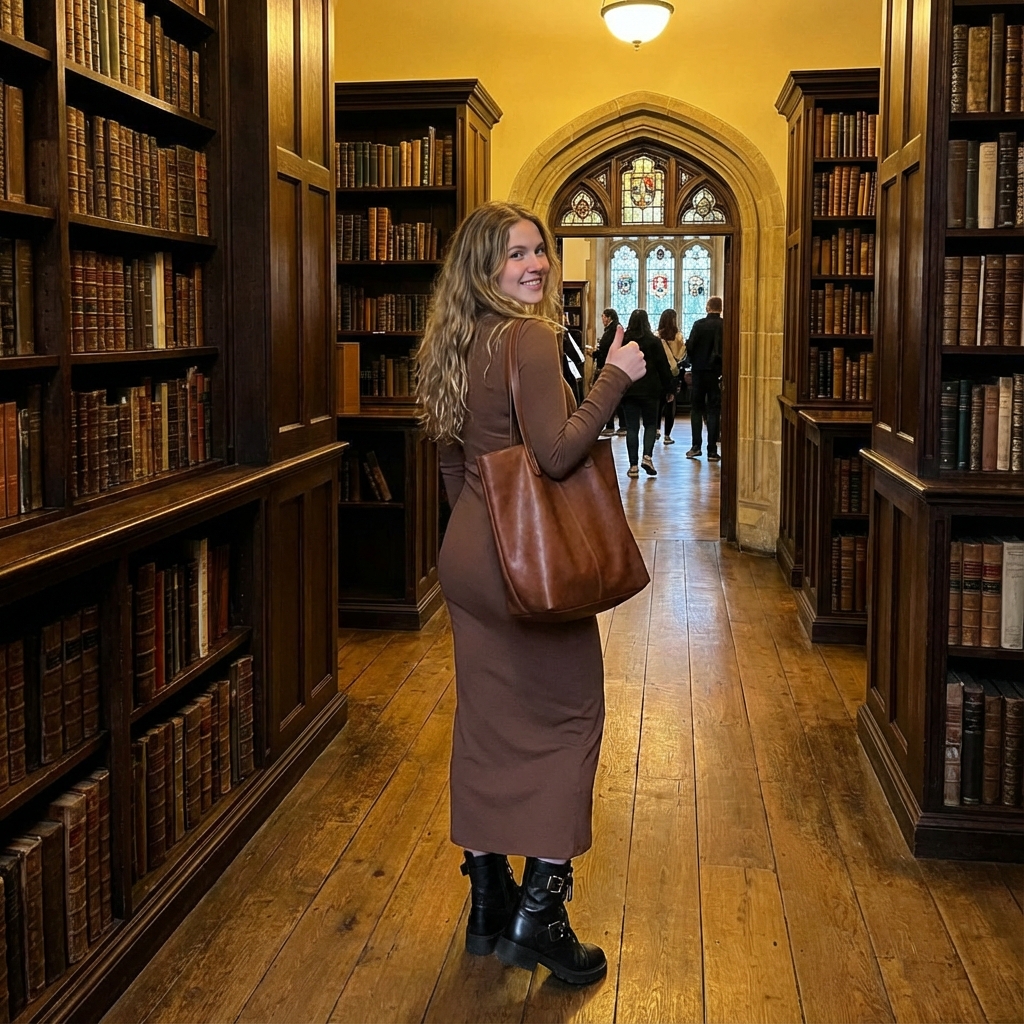 Dressed in a form-fitting brown maxi dress and black boots, she turns back to smile at the camera while standing on the worn wooden floorboards. The narrow hallway is lined with towering antique bookshelves and bathed in warm, dim lighting, creating a nostalgic and scholarly mood.