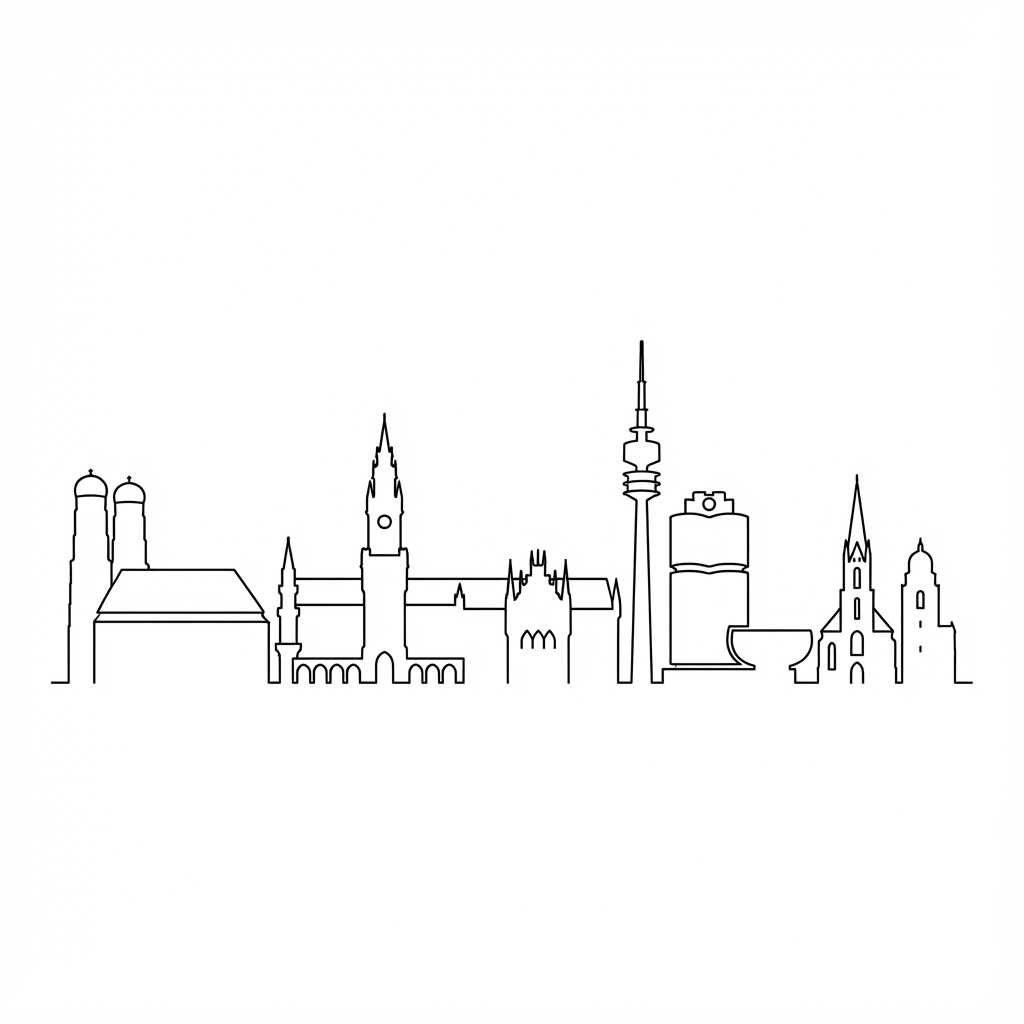 Als der beste Grafiker der Landeshauptstadt München, erstelle professionell ein Bild der Münchener Skyline. Strichstärke: 0,5 mm stark, Farbe: black. Nur den Umriss der Skyline erstellen.