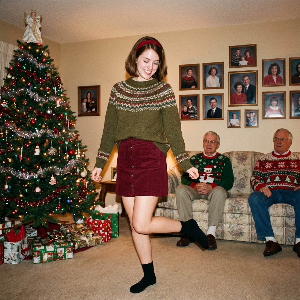 1{2 "image_analysis": {3 "environment": {4 "type": "Indoor",5 "location_type": "Living Room / Domestic Setting",6 "atmosphere": "Festive, Nostalgic, Warm, Vintage Holiday",7 "background_elements": "Beige wall with a gallery of framed family portraits, patterned sofa, Christmas tree"8 },9 "camera_specs": {10 "style": "Vintage aesthetic / Flash Photography",11 "lens_type": "Standard wide (approx 35mm)",12 "angle": "Eye-level, straight on",13 "effects": "Film grain simulation, slight vignette, direct on-camera flash look",14 "focus": "Focus on the dancing subject, slight motion blur on the raised foot"15 },16 "lighting": {17 "condition": "Mixed lighting (Artificial + Flash)",18 "sources": [19 {20 "source_id": 1,21 "type": "Camera Flash",22 "direction": "Frontal / Direct",23 "intensity": "High / Harsh",24 "color": "Cool white",25 "effect_on_subject": "Illuminates subject clearly, creates distinct drop shadows behind her, flattens features slightly"26 },27 {28 "source_id": 2,29 "type": "Christmas Tree Lights",30 "direction": "From Left",31 "intensity": "Low / Ambient",32 "color": "Multi-colored (Red, Green, Blue, Yellow)",33 "effect_on_subject": "Adds colorful bokeh and rim light on the left side"34 },35 {36 "source_id": 3,37 "type": "Room Ambient Light",38 "direction": "Overhead / General",39 "intensity": "Warm / Low",40 "color": "Tungsten / Orange-Yellow",41 "effect_on_subject": "General warm cast on the background"42 }43 ]44 },45 "subject_analysis": {46 "identity": "Young woman",47 "orientation": "Body angled slightly right, Face 3/4 view looking down",48 "emotional_state": "Joyful, Glee, Carefree",49 "action": "Dancing / Prancing",50 "posture": {51 "general_definition": "Dynamic motion, balancing on one leg",52 "feet_placement": "Left foot planted on carpet, Right foot raised behind (knee bent)",53 "hand_placement": "Arms relaxed but slightly outstretched for balance, hands in loose fists/natural curve",54 "visible_extent": "Full body (feet to head)"55 },56 "head_details": {57 "hair": {58 "color": "Medium Brown",59 "style": "Bob cut / Shoulder length, straight with slight curve",60 "accessory": "Red headband"61 },62 "face": {63 "expression": "Broad smile, teeth visible, eyes looking down/closed in laughter",64 "skin_tone": "Fair / Light"65 }66 },67 "body_details": {68 "body_type": "Slim / Petite",69 "attire": {70 "upper_body": {71 "item": "Knitted Sweater",72 "style": "Fair Isle / Nordic pattern",73 "color": "Olive Green base with white and brown geometric patterns",74 "fit": "Relaxed / Cozy",75 "texture": "Wool / Knit"76 },77 "lower_body": {78 "item": "Mini Skirt",79 "style": "A-line button-front skirt",80 "material": "Corduroy (suggested by texture)",81 "color": "Deep Red",82 "fit": "High-waisted"83 },84 "footwear": {85 "item": "Socks",86 "color": "Black",87 "style": "Ankle length",88 "notes": "No shoes worn"89 }90 }91 }92 },93 "secondary_subjects": [94 {95 "identity": "Two Older Men",96 "location": "Background, sitting on the sofa",97 "attire": "Festive sweaters (Red/Dark tones), Jeans",98 "action": "Watching the main subject",99 "emotional_state": "Passive observation / Amusement"100 }101 ],102 "objects_in_scene": [103 {104 "object": "Christmas Tree",105 "description": "Large evergreen, heavily decorated with tinsel, ornaments, and colored lights. Angel topper.",106 "position": "Left side of frame",107 "purpose": "Holiday context / Decor"108 },109 {110 "object": "Presents",111 "description": "Wrapped gift boxes",112 "position": "Under the Christmas tree",113 "colors": "Red, Green, White patterns"114 },115 {116 "object": "Wall Photos",117 "description": "Framed portraits arranged in a grid",118 "position": "Back wall",119 "content": "Family portraits, individuals and groups"120 },121 {122 "object": "Sofa",123 "description": "Beige/Tan fabric with subtle plaid or texture",124 "position": "Background right"125 }126 ],127 "negative_prompts": [128 "sadness",129 "darkness",130 "modern aesthetic",131 "high definition clean look",132 "outdoor",133 "summer",134 "suit and tie",135 "empty room",136 "shoes on carpet",137 "neon lights"138 ]139 }140}