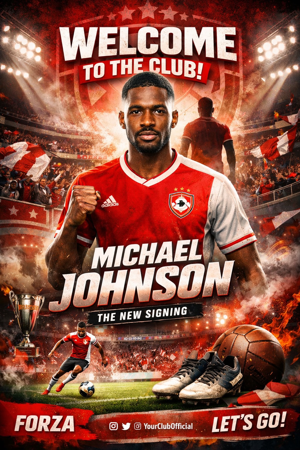 Football player introduction poster template representing football club by welcoming the player to the club . Club name is Soccer City. Color - Sky blue