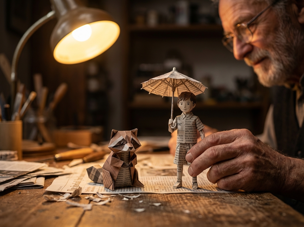 A cinematic, warm-toned close-up photograph of a craftsman working at a wooden desk in the evening. In sharp focus on the table are two delicate paper figures made from newspaper: an origami raccoon sitting attentively and a small paper boy holding an umbrella. The man’s hand gently holds and positions the paper doll, while his face appears softly blurred in the background, showing deep concentration. A single desk lamp casts dramatic, golden light from above, creating long shadows and highlighting the fine paper textures. Shallow depth of field, soft bokeh background, realistic photography style, intimate and whimsical atmosphere, storytelling composition, high contrast lighting, handcrafted aesthetic.