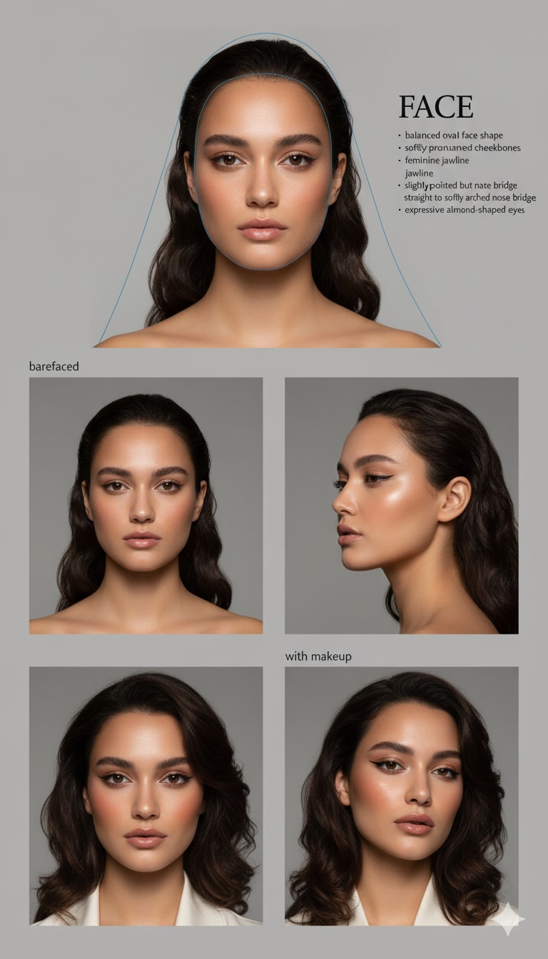 1{2 "prompt": "A minimalist editorial beauty analysis board featuring a Turkish female model with a balanced oval-to-heart face shape and softly defined jawline. Subtle Mediterranean–Anatolian facial characteristics. Neutral gray background, clean studio lighting, high realism.\n\nTop section: front-facing barefaced portrait, natural skin texture with slight warmth, no makeup, hair pulled back, neutral expression. A thin blue outline tracing the face shape.\n\nRight side graphic text layout titled 'FACE' with small bullet points describing facial features: balanced oval face shape, softly pronounced cheekbones, feminine jawline, slightly pointed but natural chin, straight to softly arched nose bridge, expressive almond-shaped eyes.\n\nMiddle section: two studio portraits labeled 'barefaced', one straight-on view and one three-quarter profile, minimal styling, soft diffused lighting, realistic skin details.\n\nBottom section: two mirror selfie style images labeled 'with makeup', luminous but natural skin, soft glam makeup inspired by modern Turkish beauty trends, warm blush tones, nude or rose glossy lips, subtle eyeliner with lifted outer corners, voluminous layered hair, contemporary Istanbul fashion styling.\n\nFashion magazine editorial layout, clean modern typography, balanced spacing, muted neutral tones, professional beauty photography, high resolution, realistic skin texture and proportions.",3 "negative_prompt": "exaggerated makeup, heavy contour, harsh shadows, cartoon style, anime, distorted facial proportions, overly sharp jawline, low resolution, oversaturated colors, messy layout, watermark, logo, text artifacts, duplicated faces, extra limbs",4 "style": "editorial beauty photography",5 "quality": "high",6 "lighting": "soft studio lighting",7 "background": "neutral gray"8}