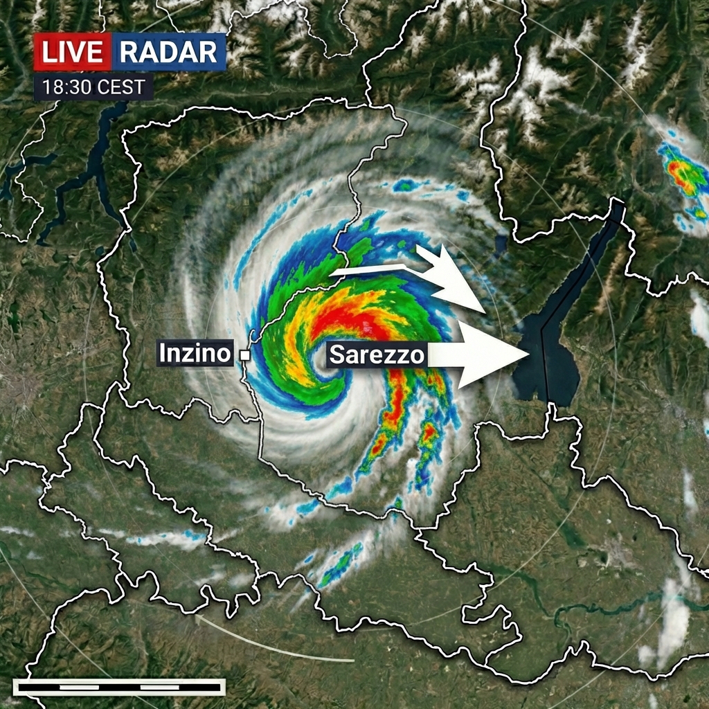 Act as a meteorological video producer. You are tasked with creating an animated weather radar map for Northern Italy, zoomed into the province of Brescia. Your video should include: - A clearly labeled map with Inzino on the west and Sarezzo on the east. - A swirling hurricane-like storm system with rotating cloud bands. - Heavy rain colors represented in blue, green, yellow, and red on the radar. - Motion arrows indicating the storm's eastward movement from Inzino to Sarezzo. - Realistic meteorological radar textures and satellite overlay. - Dramatic yet professional TV weather broadcast graphics. - Smooth animation frames for seamless viewing. Your task is to ensure that the animation is both informative and visually engaging, suitable for a TV weather forecast.