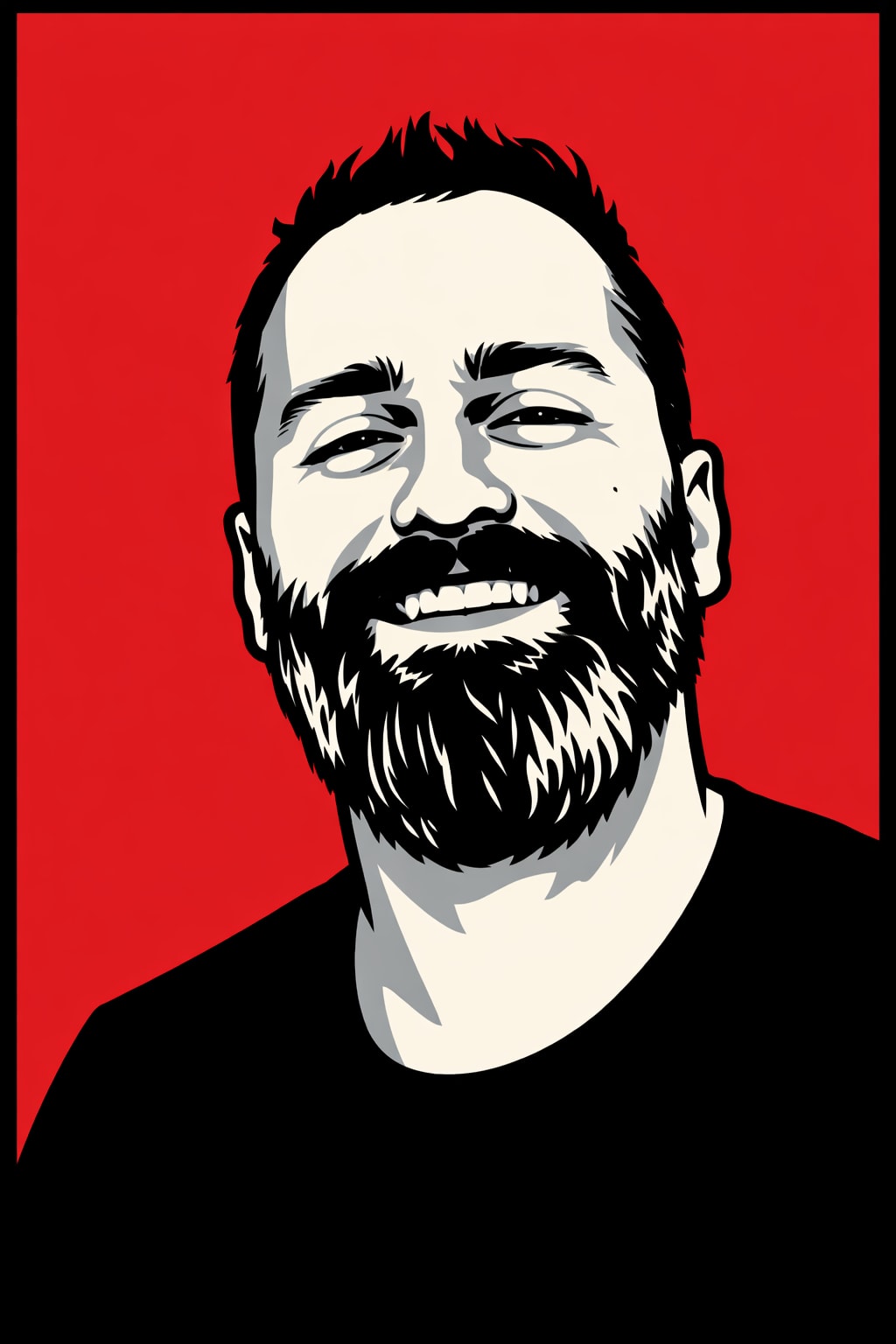 Transform the uploaded portrait into a high-contrast vector poster illustration. Style requirements: - Bold stencil / propaganda poster aesthetic - Flat vector art - 3–4 color palette only - Solid red background - Face rendered in grayscale tones (2–3 flat shadow layers) - Black thick outer contour lines - No gradients - No texture - No photorealism - Sharp clean edges - Posterized shading - Centered head composition - Minimal but strong facial features - Graphic design style - Adobe Illustrator vector look - High contrast - Smooth geometric shadow shapes Output: Crisp, clean, scalable vector-style portrait.