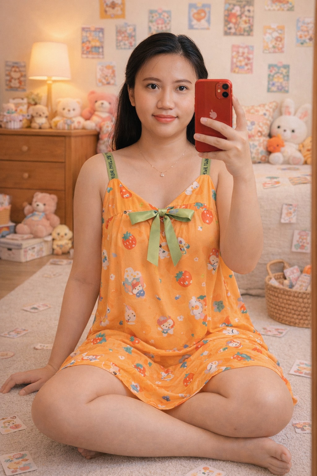 1{2 "aspect_ratio": "9:16",3 "description": "A young woman sitting on the floor in a cozy, decorated room, taking a mirror selfie with a red phone.",4 "subject": {5 "gender": "female",6 "age": "young",7 "pose": "sitting on the floor, taking a mirror selfie",8 "phone": "red",9 "hair": "dark",10 "accessories": [11 "delicate necklace"12 ],13 "outfit": {14 "type": "sleeveless, loose-fitting orange short dress",15 "prints": "colorful cartoon character prints, featuring strawberries and other cute motifs",16 "straps": {17 "color": "green",18 "details": "black writing"19 },20 "bow": {21 "location": "front",22 "style": "tied bow",23 "color": "matching green"24 }25 }26 },27 "setting": {28 "location": "cozy, decorated room",29 "furniture": [30 "warm-toned wooden furniture",31 "wicker basket"32 ],33 "decorations": [34 "posters",35 "plush toys",36 "small illustrated cards scattered around",37 "various cute and colorful decorations"38 ]39 },40 "atmosphere": [41 "playful",42 "bright",43 "casual"44 ]45}
