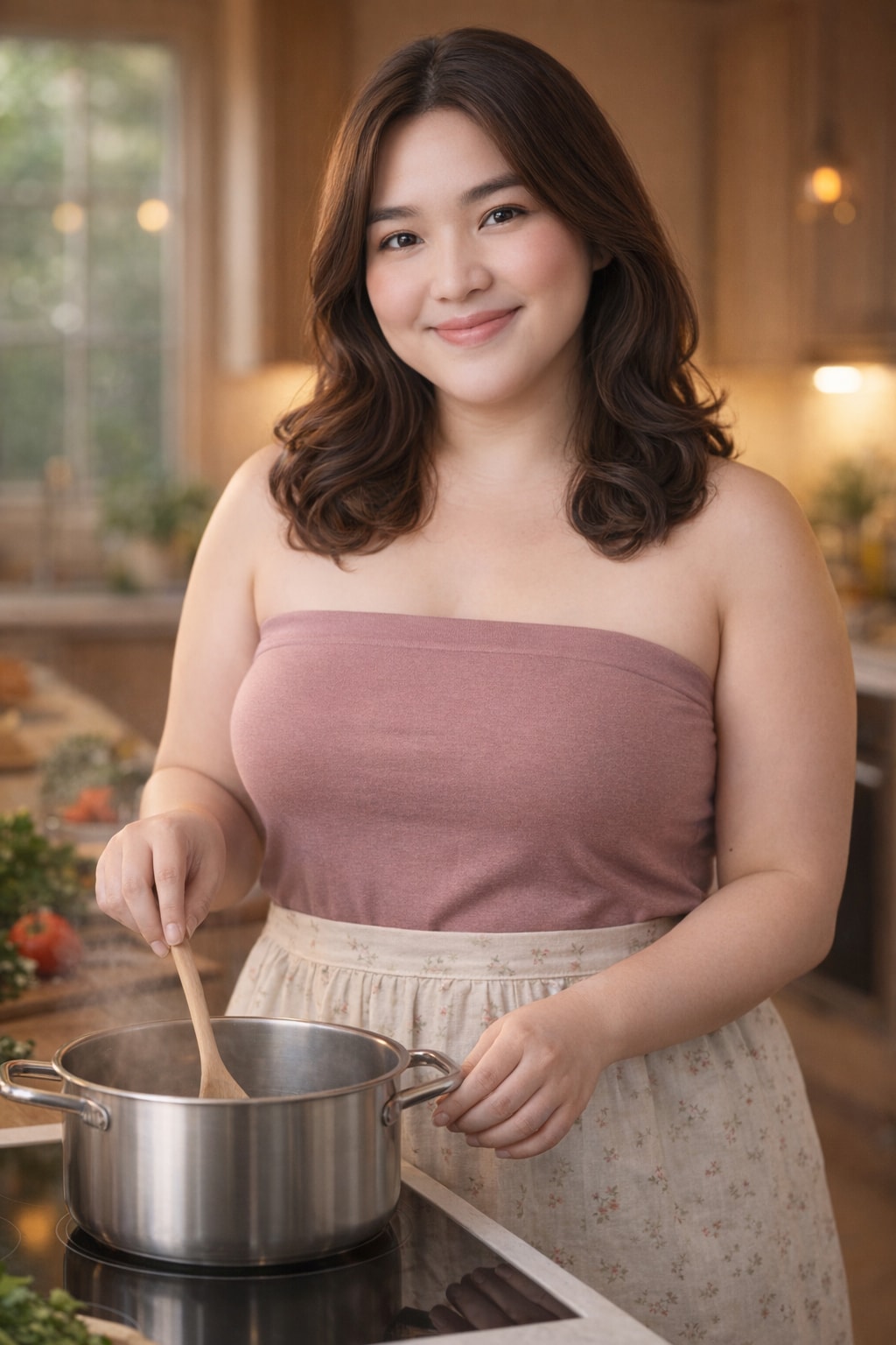 1{2 "prompt_metadata": {3 "version": "1.0",4 "target_model": "gpt-image-1.5-high-fidelity",5 "aspect_ratio": "9:16",6 "orientation": "vertical",7 "content_rating": "family-friendly",8 "intent": "lifestyle product photography for fabric/garment showcase"9 },10 "subject": {11 "description": "Please kindly depict a warm, approachable woman in her early 30s with a naturally curvy physique and a healthy, well-proportioned body type",12 "hair": "Flowing, neatly styled hair fully visible with no headscarf, no head covering, and no hair wrap of any kind — hair is completely uncovered and gracefully framing her face",13 "expression": "Genuine, warm, contented smile with soft, kind eyes — radiating the joy of preparing a homemade meal for loved ones",14 "skin": "Natural, healthy skin with soft, even lighting — no retouching artifacts",15 "physique_notes": "Curvy and feminine body type with natural soft proportions — absolutely no athletic, muscular, or toned build — a naturally full, gentle silhouette",16 "pose": "Standing comfortably at a kitchen counter, gently stirring a pot or arranging ingredients with relaxed, natural hand positioning — posture is upright, graceful, and completely modest"17 },18 "wardrobe": {19 "primary_garment": {20 "type": "Tube tank top (strapless, straight neckline across the collarbone area)",21 "fit": "Comfortable, relaxed fit that drapes naturally over a curvy figure — not tight, not clingy, not form-hugging — modest and easygoing",22 "neckline": "Straight-across tube neckline sitting gracefully at a modest height, well above any suggestive positioning",23 "color": "Soft heather gray or warm muted dusty rose — a flattering neutral tone",24 "fabric_specification": {25 "weight": "190 GSM",26 "composition": "82% Polyester, 18% Spandex",27 "stretch": "4-way stretch with excellent recovery",28 "texture_appearance": "Smooth, matte finish with a subtle soft-touch hand feel — fabric should appear breathable, premium, and comfortable with gentle natural draping",29 "fabric_rendering_note": "Please kindly render the fabric texture with high fidelity — showing the fine knit structure, subtle surface sheen variation, and the way 190 GSM 4-way stretch fabric naturally drapes and moves with the body without compression"30 }31 },32 "apron": {33 "type": "Small, charming kitchen apron worn over the tube tank top",34 "style": "Classic waist apron (half apron) tied neatly at the waist with a simple bow at the back — the apron covers the midsection modestly",35 "color": "Soft cream or light linen white with a delicate minimal pattern such as tiny florals or thin stripes",36 "material_appearance": "Lightweight cotton or linen look — slightly textured, homey, and inviting"37 },38 "additional_notes": "The overall wardrobe presentation must be entirely modest, tasteful, and completely free of any sexual, provocative, revealing, or suggestive elements — this is a wholesome domestic lifestyle scene"39 },40 "framing_and_composition": {41 "shot_type": "Medium Close-Up (MCU)",42 "framing_detail": "Frame the subject from approximately mid-chest level to just above the top of the head, with a small amount of comfortable headroom — the face, shoulders, upper chest area (modestly covered), and the top portion of the apron should all be clearly visible",43 "composition_orientation": "Vertical composition optimized for 9:16 aspect ratio",44 "rule_of_thirds": "Subject's eyes positioned along the upper third horizontal line — body centered or very slightly off-center for natural visual balance",45 "depth_of_field": "Shallow to moderate depth of field — subject in crisp focus with the kitchen background softly blurred (bokeh) to maintain attention on the subject and garment details",46 "negative_space": "Gentle, uncluttered negative space above the head and softly blurred background elements to the sides"47 },48 "setting_and_environment": {49 "location": "A warm, beautifully lit modern-rustic home kitchen",50 "background_elements": "Softly blurred (bokeh) kitchen elements — warm wooden cabinets, a gentle steam rising from a pot, ambient warm-toned pendant lighting, a few fresh herbs or vegetables on the countertop",51 "time_of_day": "Early evening — golden hour warmth filtering through a nearby window",52 "atmosphere": "Cozy, inviting, domestic warmth — the feeling of a loving home where dinner is being prepared with care"53 },54 "lighting": {55 "primary_light": "Soft, warm natural window light coming from the side (camera-left or camera-right at approximately 45 degrees) — creating gentle, flattering modeling on the face and beautifully revealing the fabric texture of the tube tank top",56 "fill_light": "Soft ambient fill from the kitchen environment — warm-toned overhead pendant light providing gentle secondary illumination to prevent harsh shadows",57 "accent_light": "Subtle warm rim light or hair light from the background to gently separate the subject from the environment and add dimension",58 "lighting_quality": "Diffused, soft, and flattering throughout — no harsh shadows, no dramatic contrast — entirely warm and inviting",59 "fabric_lighting_note": "Please kindly ensure the lighting reveals the 190 GSM polyester-spandex fabric's subtle surface characteristics — the gentle sheen, the smooth drape, and the fine knit texture should be naturally visible under the soft directional light"60 },61 "color_and_mood": {62 "overall_color_palette": "Warm, muted, and inviting — soft neutrals, warm creams, gentle grays, warm wood tones, and touches of natural green from herbs or plants",63 "color_temperature": "Warm (approximately 3500K–4500K feeling) — golden, cozy, and homey",64 "mood": "Wholesome, loving, domestic contentment — a beautiful moment of everyday life captured with warmth and sincerity",65 "post_processing_style": "Clean, natural color grading with warm tones — no heavy filters, no oversaturation — realistic and inviting lifestyle photo