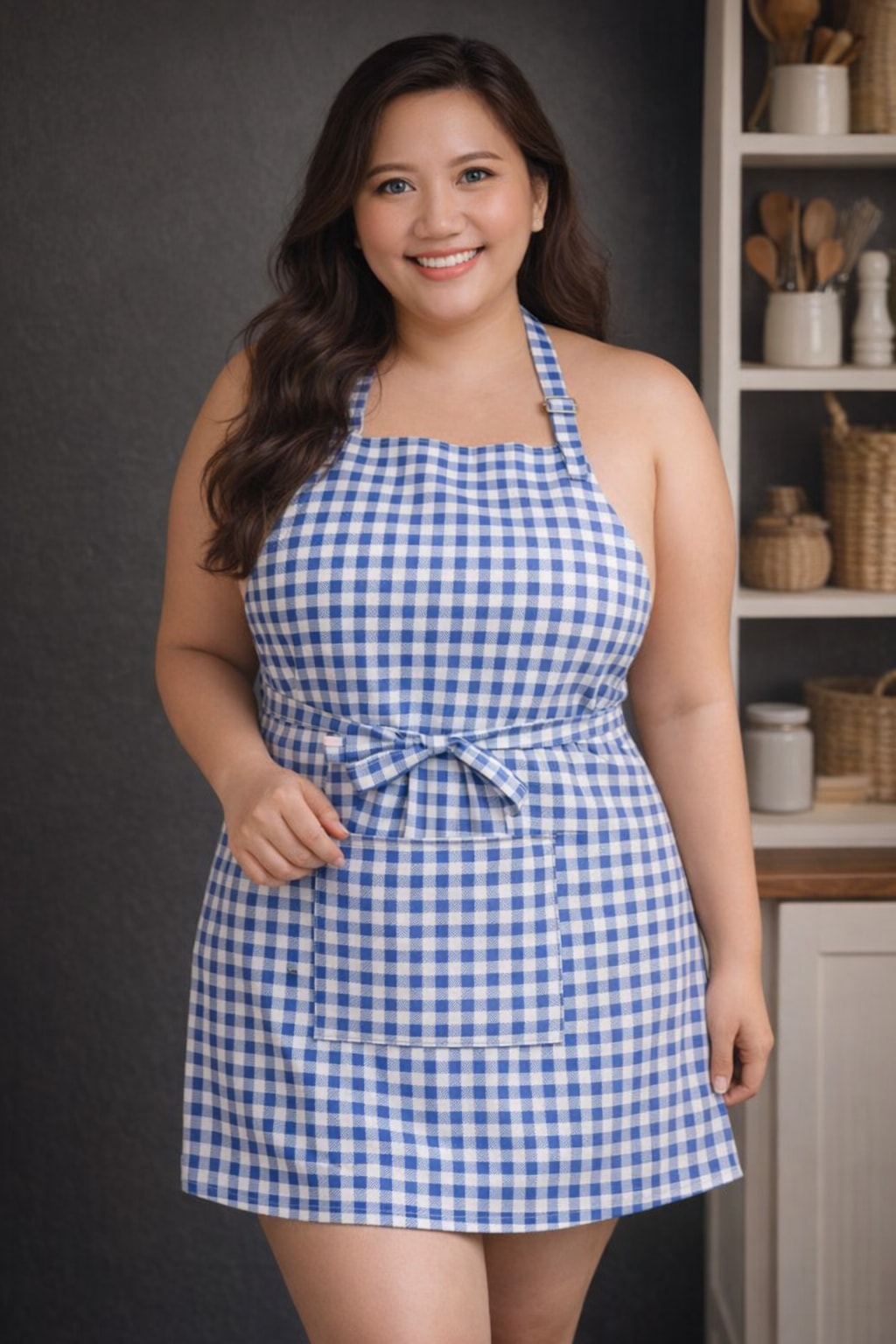 1{2 "prompt": {3 "subject": {4 "description": "A smiling woman with a curvy physique, long wavy brown hair cascading past her shoulders, bright blue eyes, slightly tanned warm skin tone, cheerful genuine expression with a natural smile, looking directly at the camera.",5 "pose": "Standing upright in a relaxed natural pose, right hand gently holding the front hem of her apron, left arm resting naturally and relaxed at her side.",6 "body_type": "Curvy, soft, naturally feminine figure with fuller proportions, not athletic."7 },8 "garment": {9 "type": "Thigh-length apron only, no shirt underneath, no pants, no skirt, no jeans. The apron is the sole garment focus of the image.",10 "style": "Classic bib-style apron with adjustable neck strap and waist ties tied in a bow at the back. The apron length ends at mid-thigh level. Clean topstitched edges, single front patch pocket centered at the lower midsection.",11 "pattern": "Blue and white classic gingham checkered pattern, evenly spaced medium-sized checks approximately 1.5 cm square, consistent repeat across entire apron surface.",12 "fabric": {13 "composition": "82% Polyester, 18% Spandex",14 "weight": "190 GSM",15 "stretch": "4-way stretch with excellent recovery and shape retention",16 "texture": "Smooth, soft hand-feel with subtle matte finish, lightweight and breathable, drapes naturally along the body contours without clinging excessively",17 "appearance": "Crisp and freshly pressed look, fabric shows gentle natural drape and soft folds where the hand gathers the hem"18 },19 "fit": "The apron fits comfortably over the curvy figure, conforming gently to the body shape thanks to the 4-way stretch fabric. The bib covers the chest area fully and modestly, waist ties cinch naturally at the waist accentuating the curvy silhouette, and the skirt portion of the apron flares slightly ending at mid-thigh length.",20 "coverage_note": "The image is modest and non-provocative. The apron provides full frontal coverage from chest to mid-thigh. All composition choices prioritize a wholesome, professional, domestic aesthetic."21 },22 "setting": {23 "location": "Cozy, well-organized indoor kitchen or cooking area",24 "background": "Dark charcoal gray painted wall directly behind the subject. To one side, a white wooden open shelf unit displaying neatly arranged kitchen utensils including wooden spoons, whisks, ceramic jars, and several woven rattan baskets of varying sizes. Warm ambient lighting creates a welcoming homey atmosphere.",25 "lighting": "Soft, warm, diffused natural light coming from the left side complemented by gentle warm interior lighting. Subtle shadows add depth without harsh contrast. Light creates a soft catchlight in the subject's blue eyes.",26 "mood": "Warm, inviting, cheerful, homey, domestic comfort."27 },28 "composition": {29 "orientation": "Vertical portrait, 9:16 aspect ratio",30 "framing": "Three-quarter length shot from head to just below mid-thigh, ensuring the full apron length is visible and the hem ending at mid-thigh is clearly shown. Subject is centered with slight left offset to allow the shelf to be partially visible on the right side of the frame.",31 "depth_of_field": "Moderate shallow depth of field, subject in sharp focus, background shelf and wall slightly soft to draw attention to the subject and apron.",32 "camera_angle": "Straight-on at eye level, slightly elevated by approximately 5 degrees for a natural flattering perspective."33 },34 "technical_specifications": {35 "model": "gpt-image-1",36 "quality": "high",37 "fidelity": "high-fidelity rendering with photorealistic detail",38 "aspect_ratio": "9:16",39 "style": "Photorealistic, high-resolution studio-quality lifestyle photography, natural color grading with warm tones, sharp textile detail showing fabric weave and stretch characteristics clearly",40 "detail_emphasis": "Fabric texture and 4-way stretch drape visible in how the material conforms to the body, gingham pattern clarity, stitching details on apron edges and pocket, natural skin texture and hair detail"41 },42 "content_safety": {43 "rating": "Safe for all audiences",44 "notes": "The image depicts a wholesome domestic kitchen scene. The apron provides full modest coverage. No sexual, provocative, or suggestive elements. The composition, pose, expression, and framing all convey a warm, friendly, professional lifestyle or product photography aesthetic suitable for commercial apron product listing or kitchen lifestyle branding."45 }46 }47}