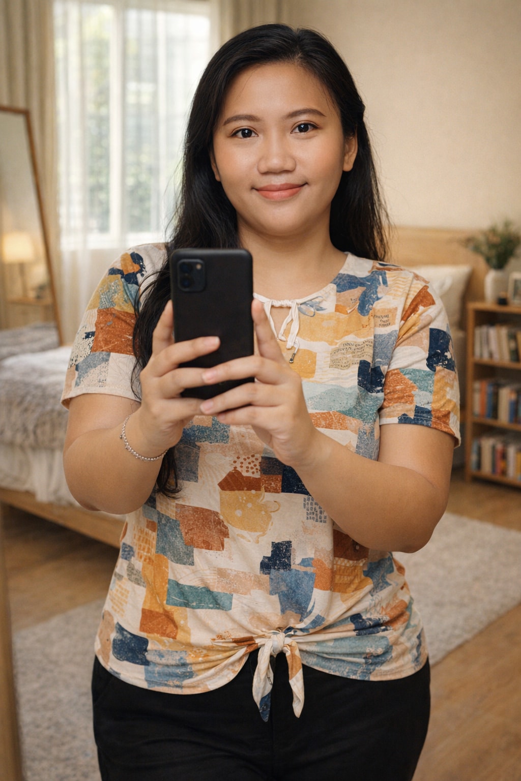 1{2 "prompt_metadata": {3 "model_target": "gpt-image-1.5-high-fidelity",4 "aspect_ratio": "9:16",5 "orientation": "vertical",6 "composition_mode": "portrait_vertical",7 "content_rating": "safe_for_all_audiences",8 "intent": "lifestyle_fashion_photography"9 },10 "scene_description": {11 "overview": "A warmly lit, vertically composed lifestyle photograph depicting a graceful young Indonesian woman in her twenties, standing in a cozy, well-decorated bedroom. She is holding a smartphone in front of her, as though capturing a casual self-portrait. The scene conveys a relaxed, bright, and inviting atmosphere with natural daylight streaming through a large window. The overall mood is cheerful, modest, and elegantly casual.",12 "composition": {13 "framing": "Medium shot, vertically oriented at 9:16 aspect ratio, with the subject centered in the frame. The camera angle is positioned very slightly below eye level, angled gently upward, focusing on the woman's upper body and the tastefully arranged interior behind her.",14 "subject_placement": "The young woman is placed at the vertical center of the composition, occupying approximately 55-60% of the frame height. Negative space above her head and below her waist allows the surrounding room details to contribute to the scene's storytelling.",15 "depth_of_field": "Moderate depth of field — the subject is in sharp focus, with the background elements (bed, shelf, window) rendered in soft but discernible detail, creating a natural and pleasing separation between foreground and background.",16 "visual_flow": "The viewer's eye is drawn first to the subject's face and the smartphone she holds, then travels down to her outfit, then outward to the interior elements: the window at the upper-left, the mirror on the left, the bed behind her, and the bookshelf at the lower-right."17 }18 },19 "subject": {20 "identity": {21 "description": "A beautiful young Indonesian woman, approximately 22-26 years of age, with a warm, friendly, and naturally pleasant expression.",22 "nationality": "Indonesian",23 "ethnicity": "Southeast Asian (Indonesian)",24 "age_range": "early to mid twenties"25 },26 "physical_appearance": {27 "face": "Soft, naturally lovely facial features characteristic of Indonesian heritage — warm brown eyes with a gentle, kind gaze; a naturally proportioned nose; full, softly smiling lips conveying warmth and approachability. Her skin tone is a beautiful warm golden-brown, smooth and naturally radiant in the daylight. No heavy makeup — just a light, natural look with perhaps a subtle touch of lip color and minimal eye enhancement.",28 "hair": "Long, naturally dark brown-black hair, flowing freely and unadorned, no headscarf or head covering of any kind. Her hair is styled in soft, loose waves or naturally straight, cascading past her shoulders. Some strands may gently frame her face.",29 "physique": "A graceful, curvy physique — naturally full-figured with soft, feminine proportions. She carries herself with poise and quiet confidence. Her body type is naturally voluptuous in a wholesome, elegant manner, portrayed respectfully and without any suggestive emphasis.",30 "height_impression": "Average to slightly above average height, conveyed through her proportions relative to the surrounding furniture."31 },32 "pose_and_action": {33 "primary_action": "She is standing upright with relaxed, confident posture, holding a smartphone in front of her face at approximately chin-to-eye level, as though she is casually taking a self-portrait photograph. Her expression is warm and naturally photogenic — a gentle, genuine smile.",34 "arm_positions": "Her right hand (or both hands) holds the smartphone steadily. Her left arm is relaxed, either helping to hold the phone or resting naturally at her side, with the thin silver bracelet visible on her left wrist.",35 "body_orientation": "She faces the camera (and her phone) almost directly, with perhaps a very slight, natural turn of the shoulders — no more than 5-10 degrees — to create a flattering, relaxed pose.",36 "demeanor": "Approachable, modest, cheerful, and naturally elegant. There is nothing provocative, suggestive, or inappropriate about her pose or expression."37 },38 "clothing_and_accessories": {39 "top": {40 "description": "A tasteful short-sleeved top featuring a creative collage-like print with various harmonious colors and subtle text or graphic elements. The top includes modest decorative cutout details and a small tie or knotting detail, adding visual interest and a fashionable touch without being revealing. The design is artistic and contemporary while remaining entirely appropriate and modest.",41 "fit": "The top fits comfortably and flatteringly on her curvy frame — neither too tight nor too loose. It drapes naturally and respectfully over her figure.",42 "fabric_specification": {43 "composition": "82% Polyester, 18% Spandex",44 "weight": "190 GSM",45 "stretch": "4-way stretch",46 "texture_appearance": "The fabric has a smooth, slightly lustrous surface with excellent drape and gentle stretch recovery. It conforms softly to the body without clinging excessively. The 190 GSM weight gives it a substantial yet comfortable feel, neither sheer nor heavy. The 4-way stretch allows natural, comfortable movement, and the fabric should appear to have a refined, premium quality with a subtle sheen under natural lighting.",47 "print_rendering": "The collage-like print appears vibrant and well-defined on the polyester-spandex blend, with crisp color reproduction and clean graphic details, characteristic of high-quality sublimation or digital printing on polyester-dominant fabrics."48 },49 "sleeve_length": "Short sleeves, ending a few inches above the elbow.",50 "neckline": "Modest, appropriate neckline — nothing low-cut or revealing."51 },52 "bottom": {53 "description": "Well-fitted black pants with a clean, tailored appearance. The pants are simple and elegant, complementing the more visually act