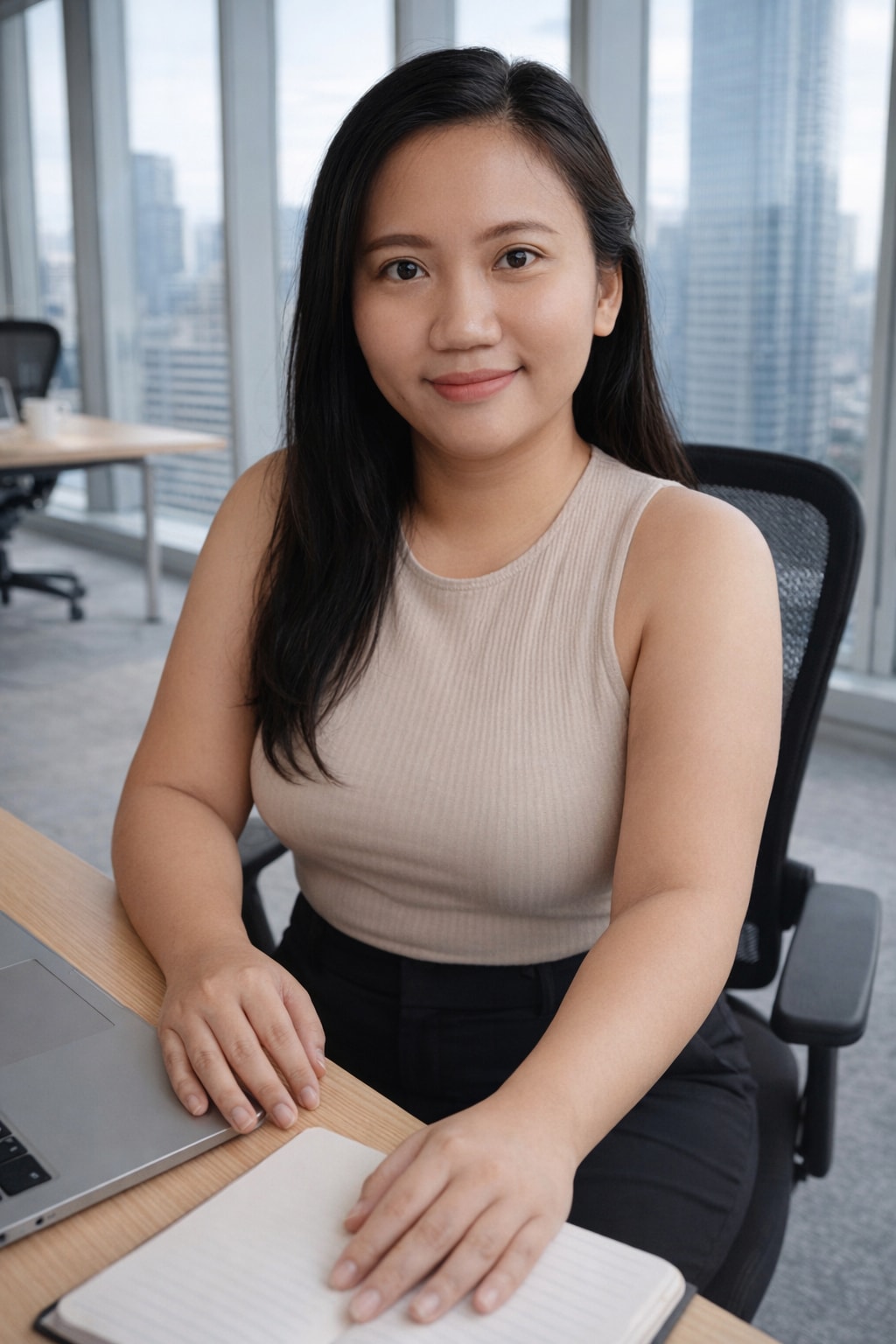 1{2 "subject": {3 "description": "A young Indonesian woman with clear, flawless skin (no tattoos), captured indoors in a modern office environment. She has a graceful presence and a petite curvy physique. She wears a stylish, modest fitted outfit. Photorealistic, 8k resolution, soft cinematic lighting.",4 "body": {5 "type": "Petite curvy physique with natural proportions.",6 "details": "Feminine silhouette with smooth, natural skin tone (no tattoos). Arms are bare with flawless skin. Abdomen has clear, healthy skin.",7 "pose": "Seated at a modern office desk, leaning slightly forward while taking a close-up photograph from desk level, with a pleasant and professional demeanor."8 }9 },10 "wardrobe": {11 "top": "Fitted neutral-toned sleeveless top made from 190 GSM 82% Polyester 18% Spandex 4-way stretch fabric, appropriate for a modern professional office setting.",12 "bottom": "High-waisted tailored trousers or a modest midi skirt in beige, grey, or black.",13 "layer": "No blazer or outerwear.",14 "accessories": "Hair styled naturally and flowing (not wearing a headscarf). No sunglasses, no jewelry, no choker, no wristwatch. Clean and minimalist appearance."15 },16 "scene": {17 "location": "A modern high-rise office space with wide floor-to-ceiling glass windows.",18 "background": "Contemporary office interior featuring a spacious desk, ergonomic office chair, laptop computer, notebook, minimal decorative elements, and an urban skyline visible through the windows.",19 "details": "Pristine office surfaces, subtle reflections on the glass windows, abundant natural daylight illuminating the space."20 },21 "camera": {22 "angle": "Desk-level perspective, close-up viewpoint as if captured from the office desk surface.",23 "lens": "Wide-angle lens with selfie perspective.",24 "aspect_ratio": "9:16",25 "orientation": "Vertical composition"26 },27 "lighting": {28 "type": "Natural daylight streaming through large glass windows.",29 "quality": "Soft, well-balanced daylight with gentle highlights and authentic indoor ambient shadows."30 },31 "style": {32 "mood": "Professional, elegant, and respectful",33 "content": "Appropriate for all audiences, no provocative or suggestive elements",34 "tone": "Clean, contemporary corporate aesthetic"35 }36}