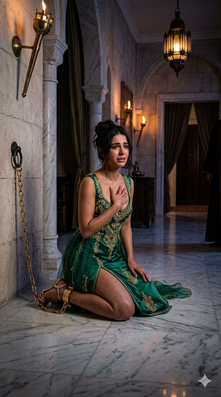 7 "key_element": "Heavy gold chain attached to a metal ring in the load-bearing wall. The other end ends in a heavy gold bracelet (ceppo) wrapped around the woman's left ankle."