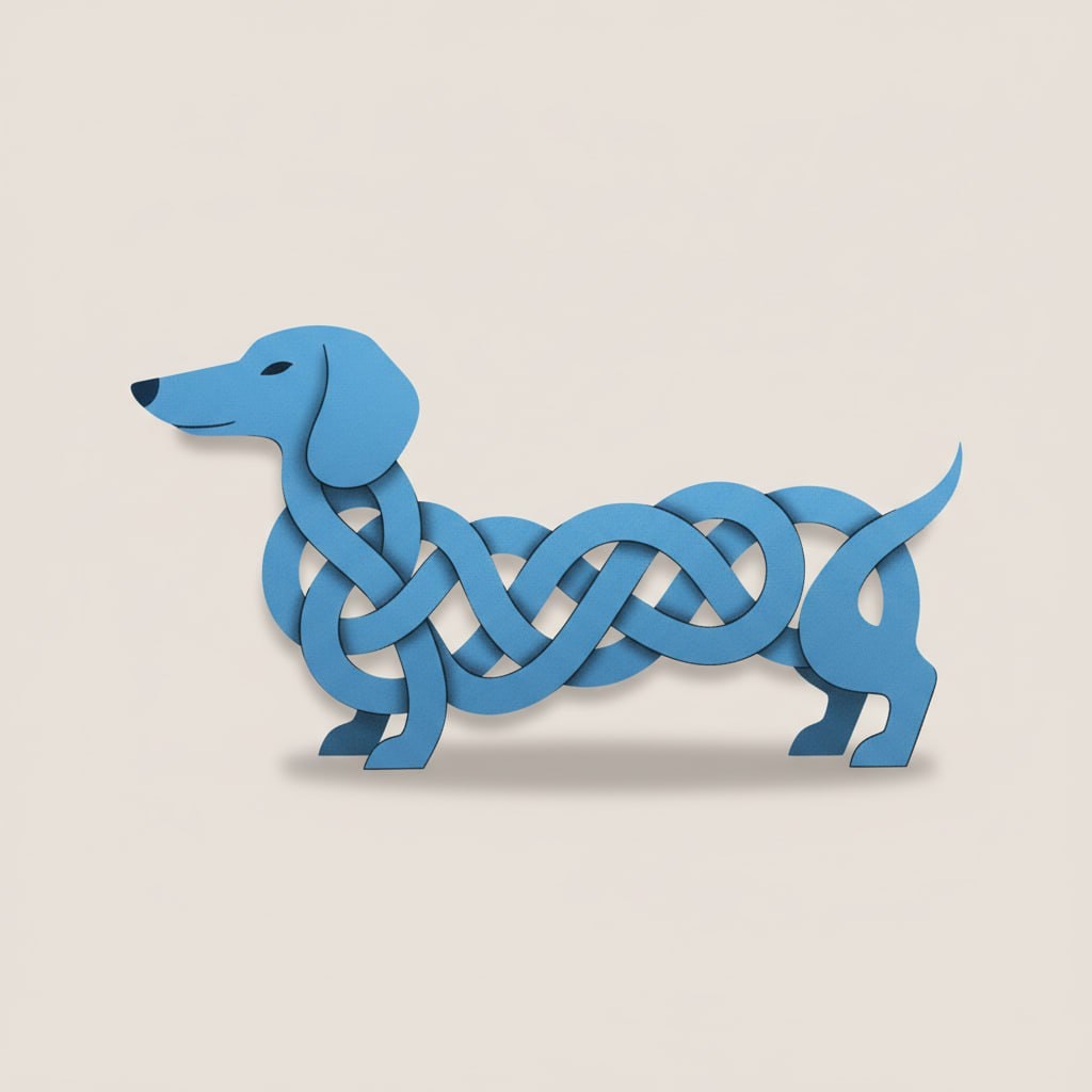 1{2 "colors": {3 "color_temperature": "neutral",4 "contrast_level": "medium",5 "dominant_palette": [6 "muted blue",7 "light gray"8 ]9 },10 "composition": {11 "camera_angle": "straight-on",12 "depth_of_field": "shallow",13 "focus": "The stylized dachshund dog",14 "framing": "The subject is centrally composed, with its elongated body forming a complex, interwoven pattern that fills the frame."15 },16 "description_short": "A minimalist graphic illustration of an extremely long, blue dachshund whose body is twisted and woven into an intricate, abstract knot against a light gray background.",17 "environment": {18 "location_type": "studio",19 "setting_details": "A plain, solid light gray background.",20 "time_of_day": "unknown",21 "weather": "none"22 },23 "lighting": {24 "intensity": "moderate",25 "source_direction": "ambient",26 "type": "soft"27 },28 "mood": {29 "atmosphere": "Playful and clever graphic design",30 "emotional_tone": "calm"31 },32 "narrative_elements": {33 "environmental_storytelling": "The image is a visual pun on the dachshund's long body, exaggerating it to an absurd degree to create a decorative, knot-like pattern, blending animal form with abstract design.",34 "implied_action": "The dog is presented as a static, decorative element, not in motion."35 },36 "objects": [37 "Dachshund dog"38 ],39 "people": {40 "count": "0"41 },42 "prompt": "A minimalist graphic illustration of a stylized blue dachshund. The dog's body is impossibly long, intricately woven over and under itself to form a complex, Celtic knot-like pattern. The design is clean and modern, with subtle texturing on the blue form and soft shadows creating a slight 3D illusion. The entire figure is set against a solid, light warm-gray background. The overall aesthetic is playful, clever, and artistic.",43 "style": {44 "art_style": "graphic illustration",45 "influences": [46 "minimalism",47 "flat design",48 "celtic knotwork",49 "vector art"50 ],51 "medium": "digital art"52 },53 "technical_tags": [54 "minimalist",55 "graphic design",56 "illustration",57 "vector art",58 "dachshund",59 "dog",60 "flat design",61 "knot",62 "abstract",63 "stylized"64 ],65 "use_case": "Graphic design inspiration, poster art, stock illustration, or training data for stylized animal illustrations."66}