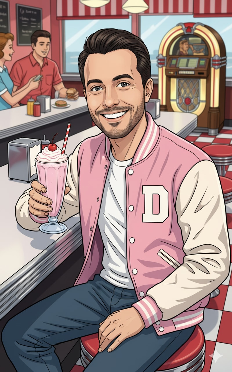 1{2 "prompt": "You will perform an image edit using the person from the provided photo as the main subject. The face must remain clear and unaltered. Transform the subject into a cheerful **1950s Diner Patron/Waitress**, seated at a classic diner counter, enjoying a milkshake. Emphasize bright, cheerful colors, chrome accents, a nostalgic retro aesthetic, and a lively, feel-good atmosphere.",3 "details": {4 "year": "1950s (Mid-Century Americana)",5 "genre": "Retro / Nostalgia / Pop Art / Slice of Life",6 "location": "A classic American diner interior. Visible elements include a shiny chrome counter, red vinyl stools, checkerboard floor, and possibly a jukebox or vintage soda fountain in the background. Bright, inviting lighting.",7 "lighting": "Bright, even, and slightly diffused incandescent lighting, typical of a bustling diner. Everything is clearly illuminated, creating a cheerful, inviting glow.",8 "camera_angle": "Medium close-up, capturing the subject from the chest up, with enough of the counter and background to establish the diner setting. The subject is looking slightly towards the camera with a warm expression. (1:1 composition).",9 "emotion": "Joyful, relaxed, friendly, and carefree.",10 "costume": "Classic 1950s attire: for a patron, a brightly colored (e.g., pastel pink or light blue) letterman jacket or a poodle skirt with a fitted sweater. For a waitress, a crisp uniform (e.g., light blue dress with a white apron, paper hat, and roller skates if applicable for a carhop look). Hair is styled in a classic 50s bouffant or ponytail.",11 "color_palette": "Vibrant and cheerful primary colors (red, blue, yellow) mixed with soft pastels (pink, mint green, baby blue) and shiny chrome silver. Strong, clean lines define objects. Everything looks fresh and inviting.",12 "atmosphere": "Upbeat, nostalgic, lively, and incredibly friendly. A sense of youthful innocence and fun, set to the background hum of a jukebox.",13 "subject_expression": "A wide, genuine smile with bright, sparkling eyes. A slight tilt of the head, conveying friendliness and openness.",14 "subject_action": "One hand is holding a tall, frosted milkshake glass with a striped straw, perhaps mid-sip. The other hand is resting casually on the chrome counter or gesturing lightly. Body language is relaxed and happy.",15 "environmental_elements": "A perfect, whipped cream-topped milkshake with a cherry. Reflections of the diner's neon signs (if any) or bright lights on the chrome surfaces. A classic diner menu or napkin dispenser on the counter. Perhaps a faint 'Wurlitzer' logo on a distant jukebox."16 }17}