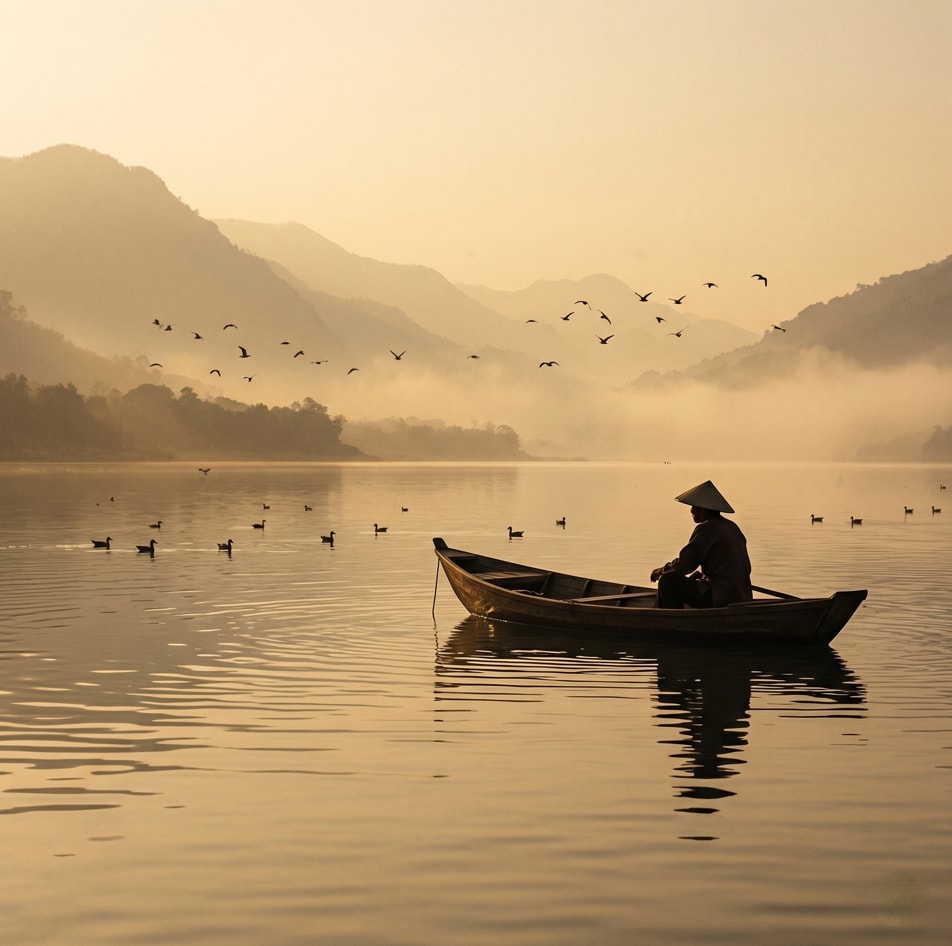 1{2 "colors": {3 "color_temperature": "warm",4 "contrast_level": "low",5 "dominant_palette": [6 "sepia",7 "taupe",8 "dark slate gray",9 "khaki",10 "goldenrod"11 ]12 },13 "composition": {14 "camera_angle": "wide shot",15 "depth_of_field": "deep",16 "focus": "Person in boat",17 "framing": "The main subject, the boat and person, are placed off-center to the right within a 1:1 square format, following the rule of thirds. Horizontal layers of water, shoreline, and mountains are preserved and adapted to fit the square frame, maintaining depth and tranquility."18 },19 "description_short": "A lone person wearing a conical hat sits in a traditional wooden boat on a calm lake at sunrise or sunset, surrounded by birds, with hazy mountains in the background.",20 "environment": {21 "location_type": "outdoor",22 "setting_details": "A serene lake or river with calm, reflective water. In the background, a distant, hazy mountain range rises above a low shoreline with trees. The atmosphere is filled with a golden mist.",23 "time_of_day": "evening",24 "weather": "hazy"25 },26 "lighting": {27 "intensity": "moderate",28 "source_direction": "back",29 "type": "natural"30 },31 "mood": {32 "atmosphere": "Peaceful and contemplative solitude",33 "emotional_tone": "calm"34 },35 "narrative_elements": {36 "environmental_storytelling": "The traditional boat, conical hat, and vast, quiet landscape suggest a timeless, rural way of life, possibly fishing or commuting in a place untouched by modernity. The golden haze creates a dreamlike, nostalgic feeling.",37 "implied_action": "The person is likely paddling slowly or pausing to observe the surroundings, suggesting a routine journey or a moment of reflection amidst nature."38 },39 "objects": [40 "boat",41 "person",42 "water",43 "birds",44 "mountains",45 "conical hat"46 ],47 "people": {48 "ages": [49 "adult"50 ],51 "clothing_style": "Traditional attire including a conical hat.",52 "count": "1",53 "genders": [54 "unknown"55 ]56 },57 "prompt": "A cinematic, wide-angle photograph in a 1:1 square format of a lone figure in a traditional wooden boat, silhouetted against the hazy golden light of a serene sunset. The person wears a conical hat, resting peacefully in the boat on a calm, rippling lake. The composition is balanced within a square frame with the subject slightly off-center. In the distance, misty mountains fade into the warm sky. Flocks of birds fly overhead and float on the water, adding life to the tranquil scene. The atmosphere is calm and timeless, with a soft, grainy film texture.",58 "style": {59 "art_style": "realistic",60 "influences": [61 "cinematic photography",62 "landscape photography",63 "travel photography"64 ],65 "medium": "photography"66 },67 "technical_tags": [68 "silhouette",69 "wide shot",70 "landscape",71 "golden hour",72 "hazy",73 "atmospheric perspective",74 "serene",75 "natural light",76 "reflection",77 "film grain",78 "square format",79 "1:1 aspect ratio"80 ],81 "use_case": "Travel and tourism promotion, stock photography, cinematic reference, background imagery."82}