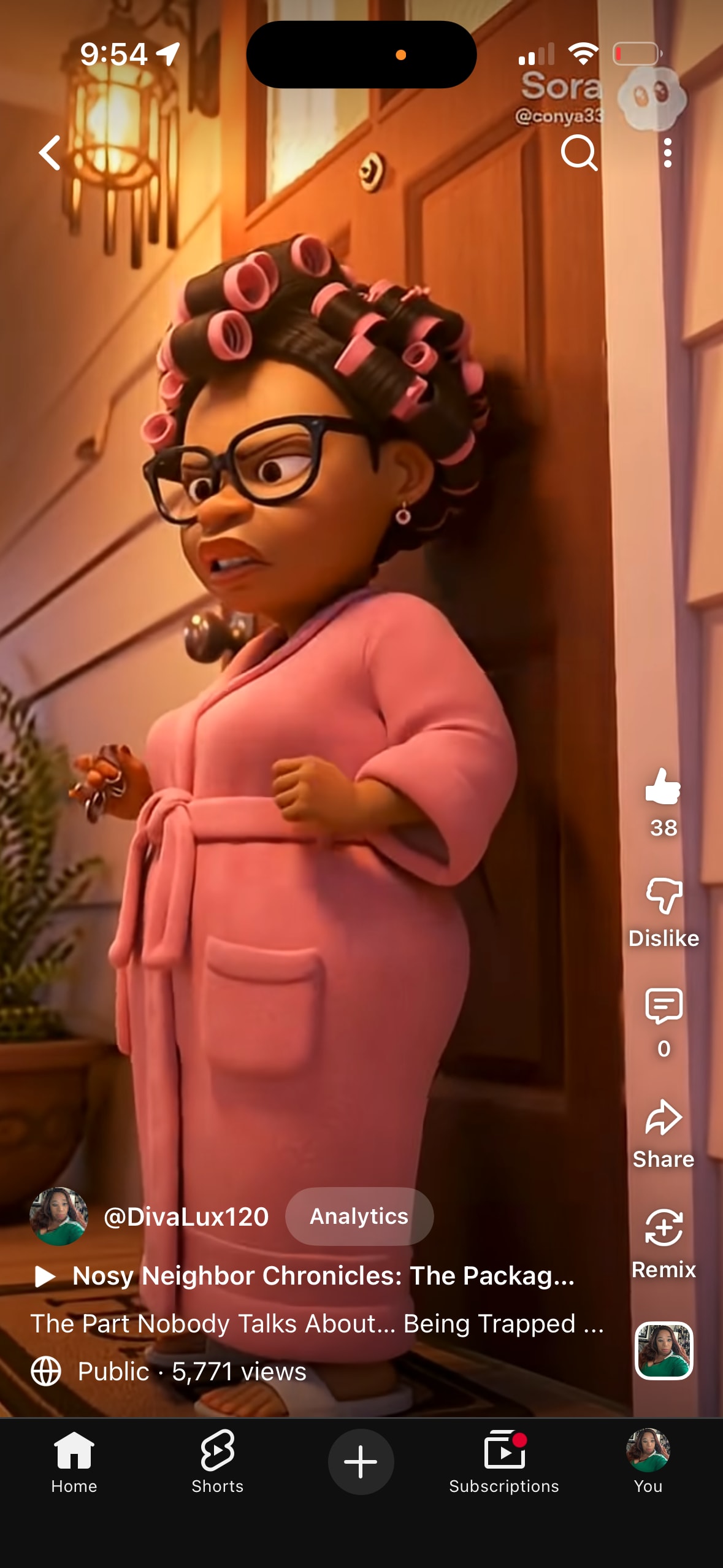 Miss Nancy is an older African-American woman with pink hair rollers, a pink robe, pink slippers, large round glasses, and big expressive bug eyes. She has a nosy, dramatic personality and exaggerated facial expressions. Scene takes place inside her living room during the daytime. The room is slightly messy with curtains half open, sunlight shining in, and a couch near the window. Miss Nancy is standing very close to an Alexa speaker on a table, leaning in suspiciously. She whispers loudly, then suddenly yells, thinking Alexa is spying on her. Her bug eyes widen dramatically, and she clutches her robe. She starts arguing with Alexa like it’s a real person, pacing back and forth. She points at it, gasps, then backs up slowly like she’s scared. Then she quickly grabs it, shakes it, and demands answers. Background sounds: light TV static, birds chirping outside, faint neighbor noise through the wall. Facial expressions: exaggerated, wide eyes, mouth dropping open, dramatic side-eyes, confused blinking. Camera: medium close-up, slight zoom-in when she gets dramatic. Lighting: bright daytime, soft shadows. Style: colorful, cartoon, not realistic. No text on screen. No subtitles. No watermarks.