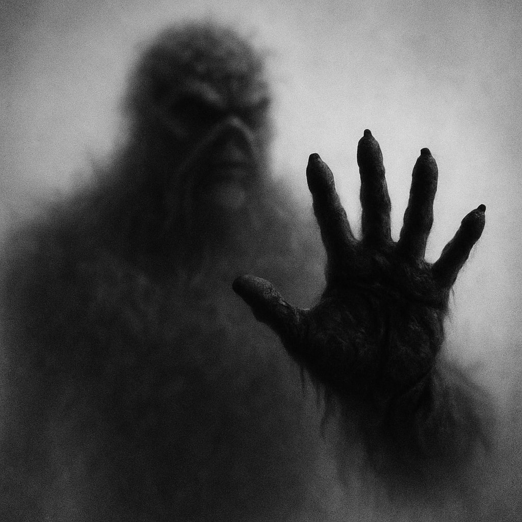 A black and white photograph shows the blurred silhouette of a subject behind a frosted or translucent surface. The part is sharply defined and pressed against the surface, creating a stark contrast with the rest of the hazy, indistinct figure. The background is a soft gradient of gray tones, enhancing the mysterious and artistic atmosphere