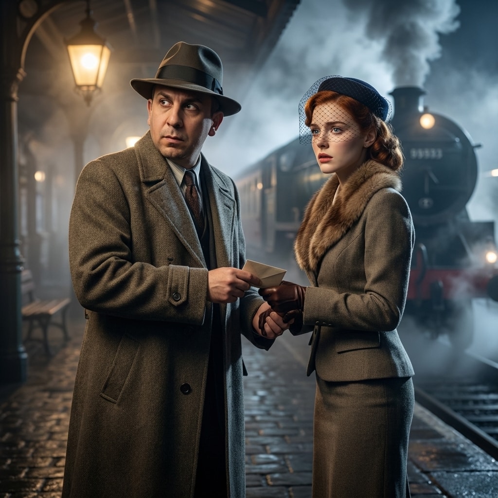 A tense, melancholic moment captured in war-torn London. On a wet, steam-filled railway platform, a stoic man in a trench coat and an anxious woman secretly hand over vital information while alert for surveillance. A high-tension thriller scene with rich period details.