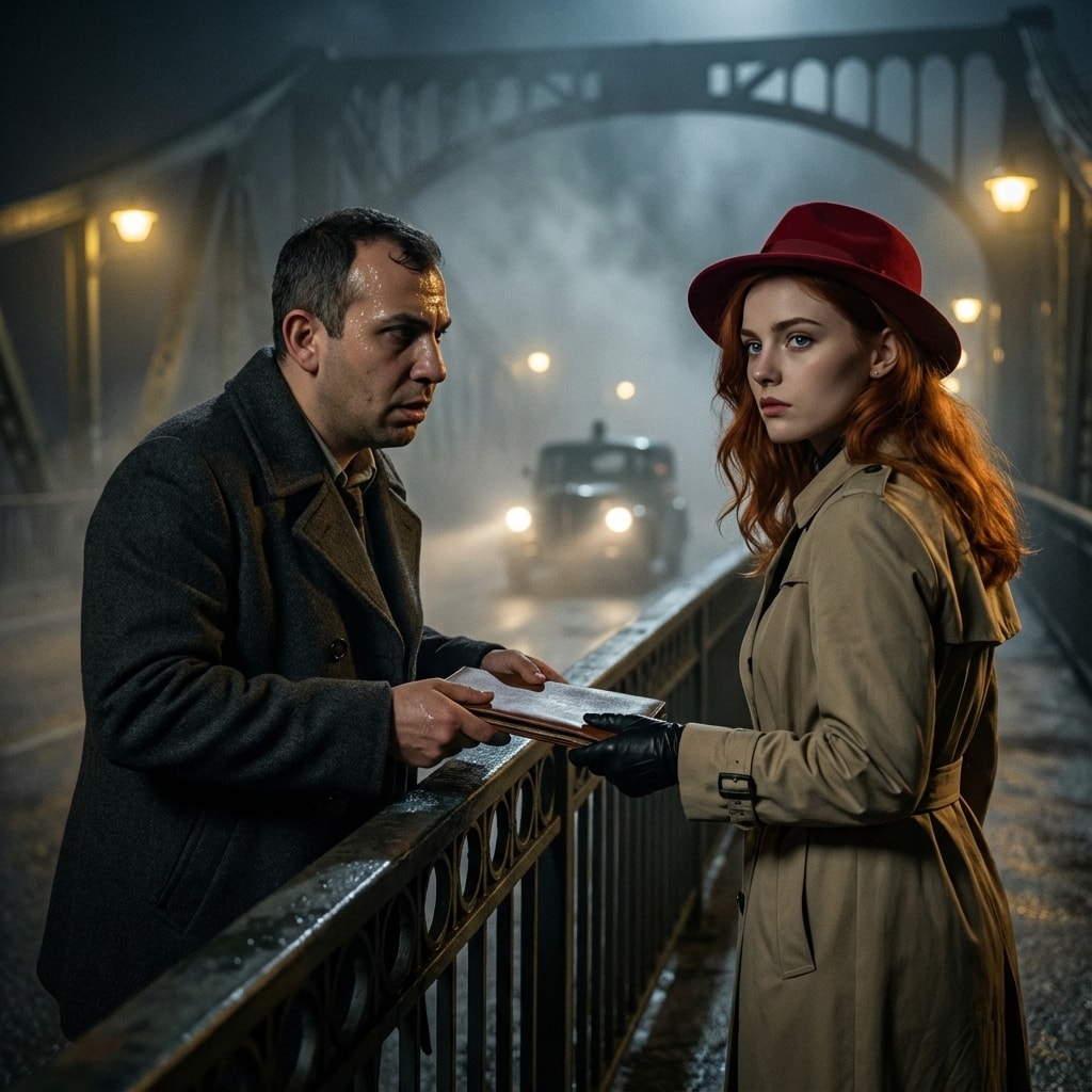 A tense, clandestine meeting shrouded in thick river fog on an iron bridge. This cinematic medium close-up uses volumetric lighting to highlight the urgent handoff of a leather dossier between two spies, capturing the chilling atmosphere of the era with shallow depth of field.